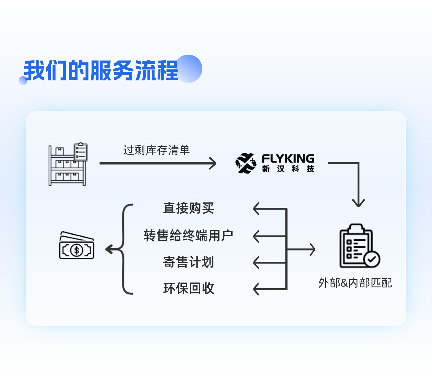 在服務(wù)模式上,新漢科技始終強(qiáng)調(diào)系統(tǒng)化與高效性??蛻糁恍鑼⑦^剩庫存清單交付給我們,我們能應(yīng)用智能數(shù)據(jù)系統(tǒng),對(duì)過剩庫存進(jìn)行智能分類和高效匹配,通過匹配上下游供應(yīng)鏈需求為客戶提供購買、轉(zhuǎn)售、寄售、環(huán)?;厥盏确桨福瑤椭蛻艮D(zhuǎn)虧為盈。