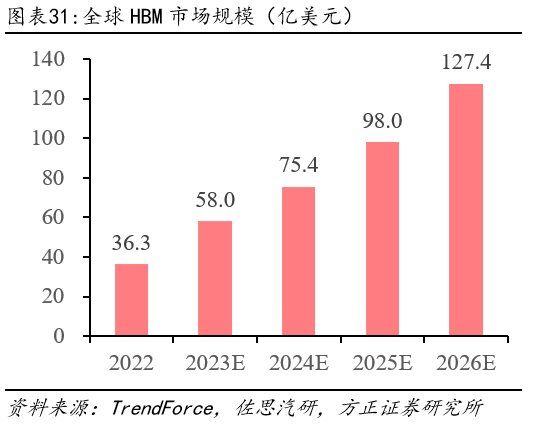 根據(jù)TrendForce數(shù)據(jù)顯示,高端AI服務(wù)器GPU搭載HBM芯片已成為主流。2022年全球HBM容量約為1.8億GB,2023年增長約60%達到2.9億GB,2024年將再增長30%,以HBM每GB售價20元美元測算,2022年全球HBM市場規(guī)模約為36.3億美元,預計至2026年市場規(guī)模將達127.4億美元,復合年增長率約37%。